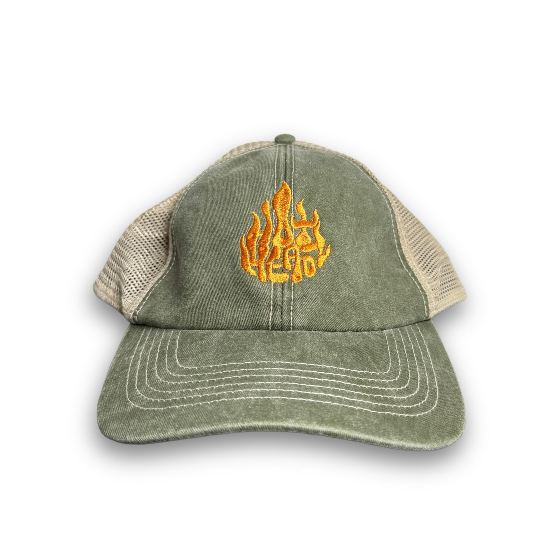 - Vintage style stone wash olive trucker cap with snapback enclosure